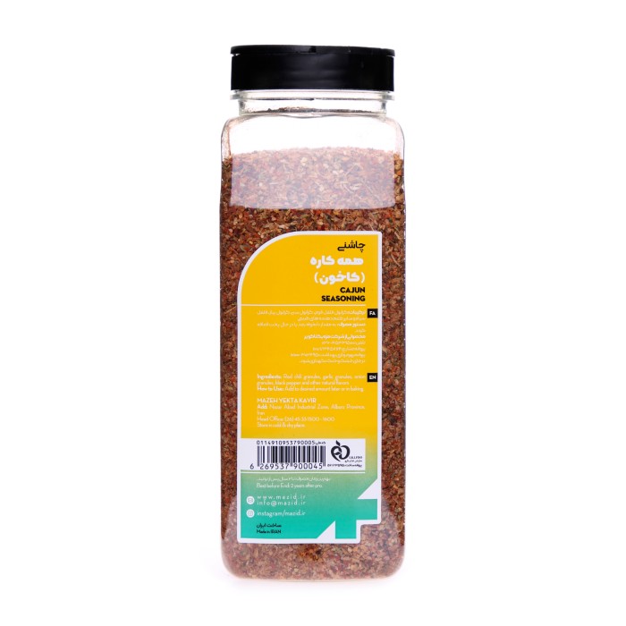 Mazid Cajun All-Purpose Seasoning is offered in 600 g packaging. It has a long shelf life of 24 months.