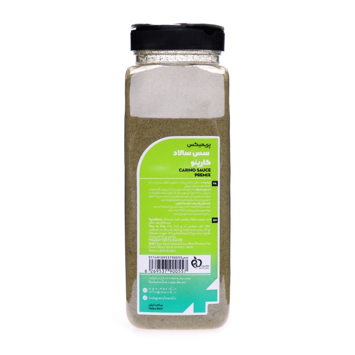 Be sure to try Mazid Carino Salad Sauce Premix 550 g. The Carino salad Sauce also contains almond slivers, adding a crunchy texture to any salad. In addition, it includes other ingredients such as basil, parsley, black pepper, and various flavor enhancers.