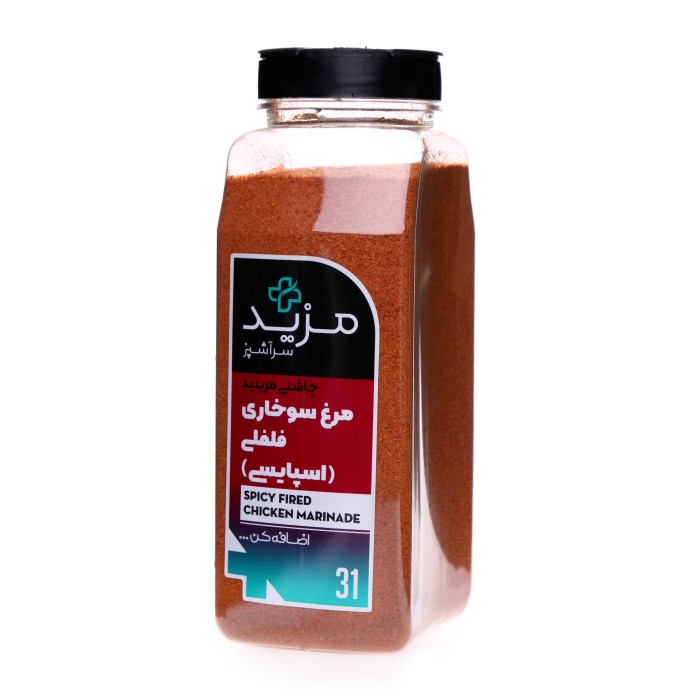 This product offers several key benefits, including: Adding flavor and a spicy kick to chicken pieces, eliminating unpleasant chicken odor, allowing the spicy marinade solution to deeply penetrate chicken breast meat, easy preparation without the need for advanced equipment, reducing excess blood and moisture from bone-in pieces after marination, ensuring consistent spicy flavor quality in chicken, enabling storage of marinated chicken in the refrigerator for up to 72 hours, creating a tender and soft meat texture, keeping chicken juicy, especially in the breast, delivering a spicy taste even in dense chicken breast tissue, Increasing the chicken’s weight by approximately 10% compared to its original weight.