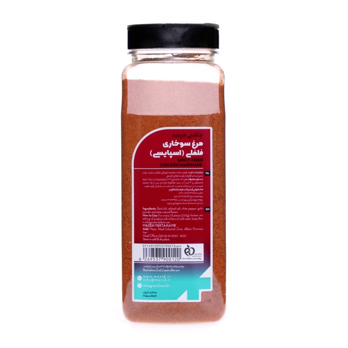 A proper chicken marinade should be a blend of the finest spices mixed with a liquid base and applied to the meat. Mazid Spicy Chicken Marinade 650 g is made from garlic powder, red pepper, white pepper with aromatic herbs. With its fully powdered texture, this seasoning mixes easily with liquids, allowing you to marinate a wide variety of dishes or even prepare different sauces.