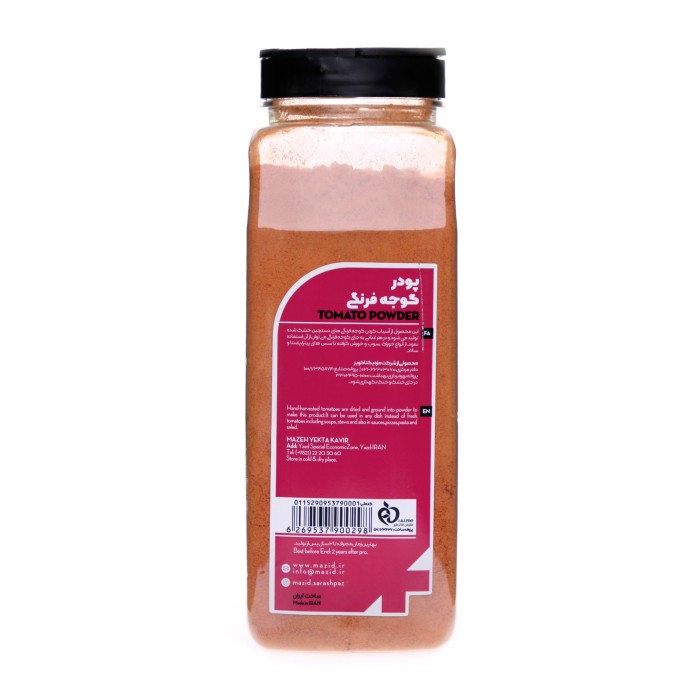 The Mazid 500 g Tomato Powder is one of the best seasonings for marinating chicken and meat and serves as an ideal spice for grilling. Its preparation follows a precise process: hand-picked tomatoes are sliced, dried, and their seeds removed. The dried slices are then finely ground in an industrial mill. This tomato powder offers numerous health benefits and can greatly enhance the thickness and richness of various stews. It is also perfect for making pizza sauces. Simply combine it with a little warm water, thyme powder and basil with garlic to create a flavorful sauce for any pizza. With Mazid 500 g Tomato Powder, you can create a variety of seasonings. Mix it with apple cider vinegar, a touch of sugar, and other spices such as mustard powder, ginger, and black pepper to add a unique flavor to any dish. The 500 g packaging is suitable for multiple uses, and the best way to preserve this flavorful spice is to store it in a dry, cool environment.